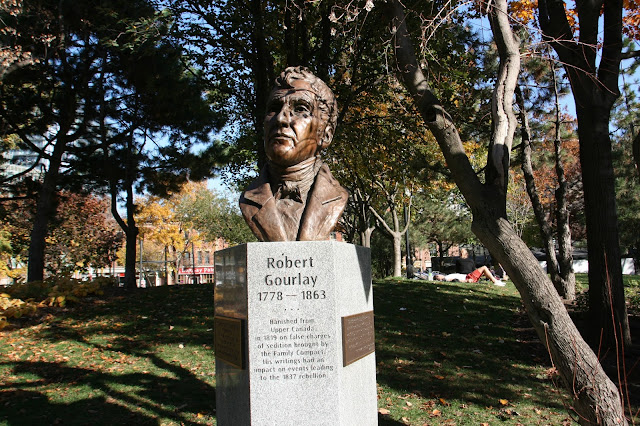 "Between 1826 and 1838, Court House Square was used for a variety of religious and political gatherings. Supporters of William Lyon Mackenzie rallied here after his ejections from the Legislative Assembly in 1832. With its proximity to the Home District Court House and the jail, the square was used for public floggings and for punishment in the stocks - their last recorded use: Ellen Halfpenny, for drunken and disorderly conduct in 1834. The first hanging here was on 23 October 1828: Charles French for the midnight shooting of Edward Knowlan. The most famous hangings, and the last performed here, were on 12 April 1838: Samuel Lount and Peter Matthews, for their participation in the 1837 Rebellion."