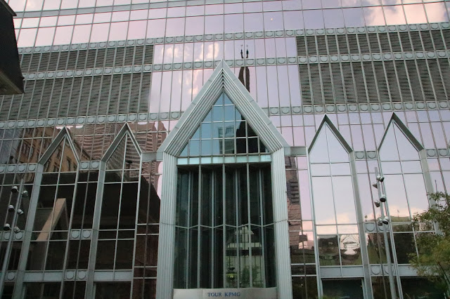 In the 1980s, a vast real estate project was undertaken below the cathedral. The project consisted of a 34-floor skyscraper, Tour KPMG built north of the Cathedral, underground parking, and two levels of retail stores situated beneath the cathedral. For a period in 1987, the Cathedral was supported on stilts while footings for the underground mall, Promenades Cathédrale, were excavated. This project allowed for the linkage of the eastern and western branches of Montreal's underground city, connecting Eaton's (now Les Ailes de la Mode) and The Bay.