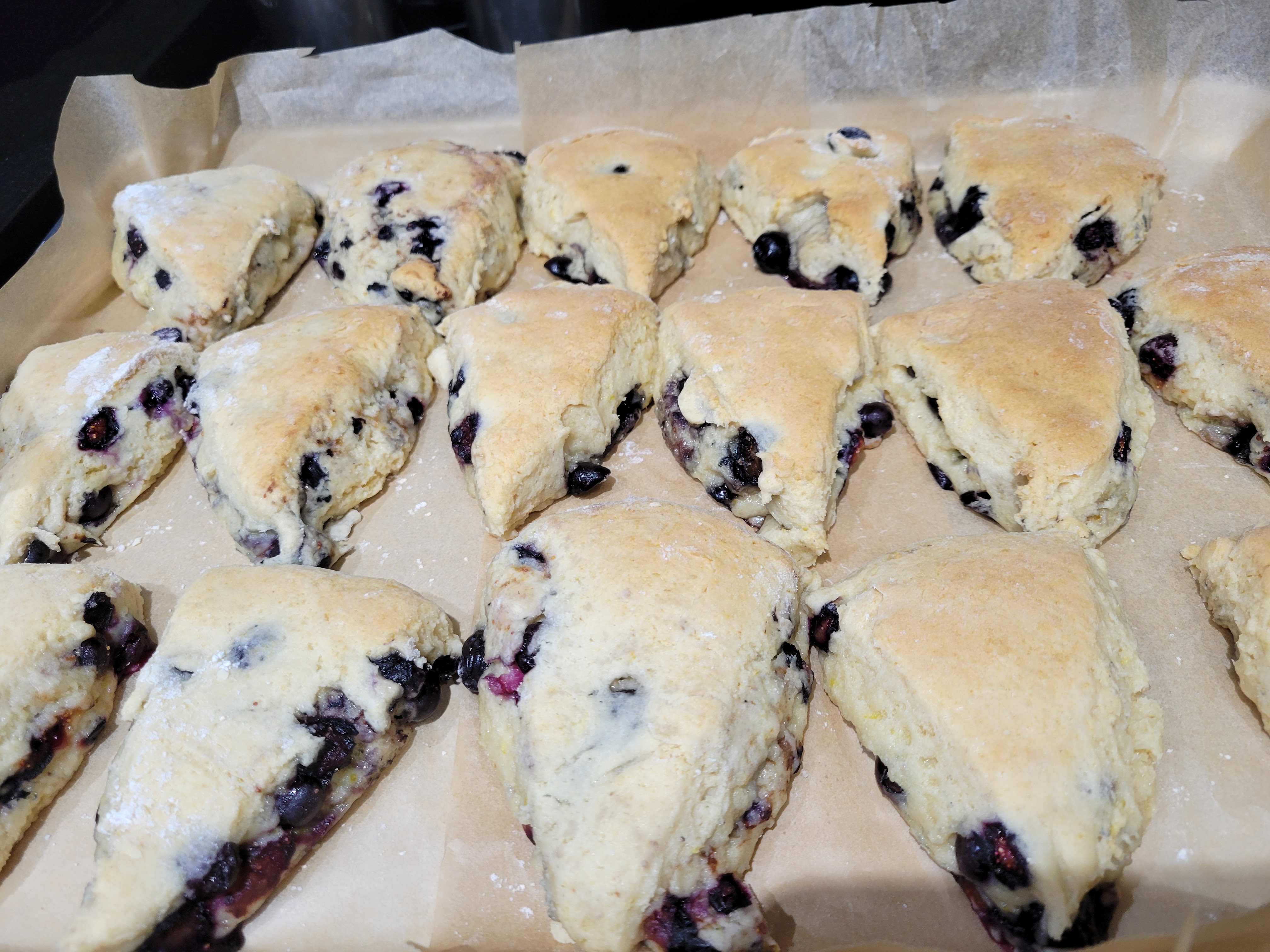I made these scones, from Chef Alina with Cup4Cup flour, a surprise that it made 16, I am so used to gluten free recipes only making 6 or 8. I used about 378 grams of the heavy cream and added frozen blueberries.