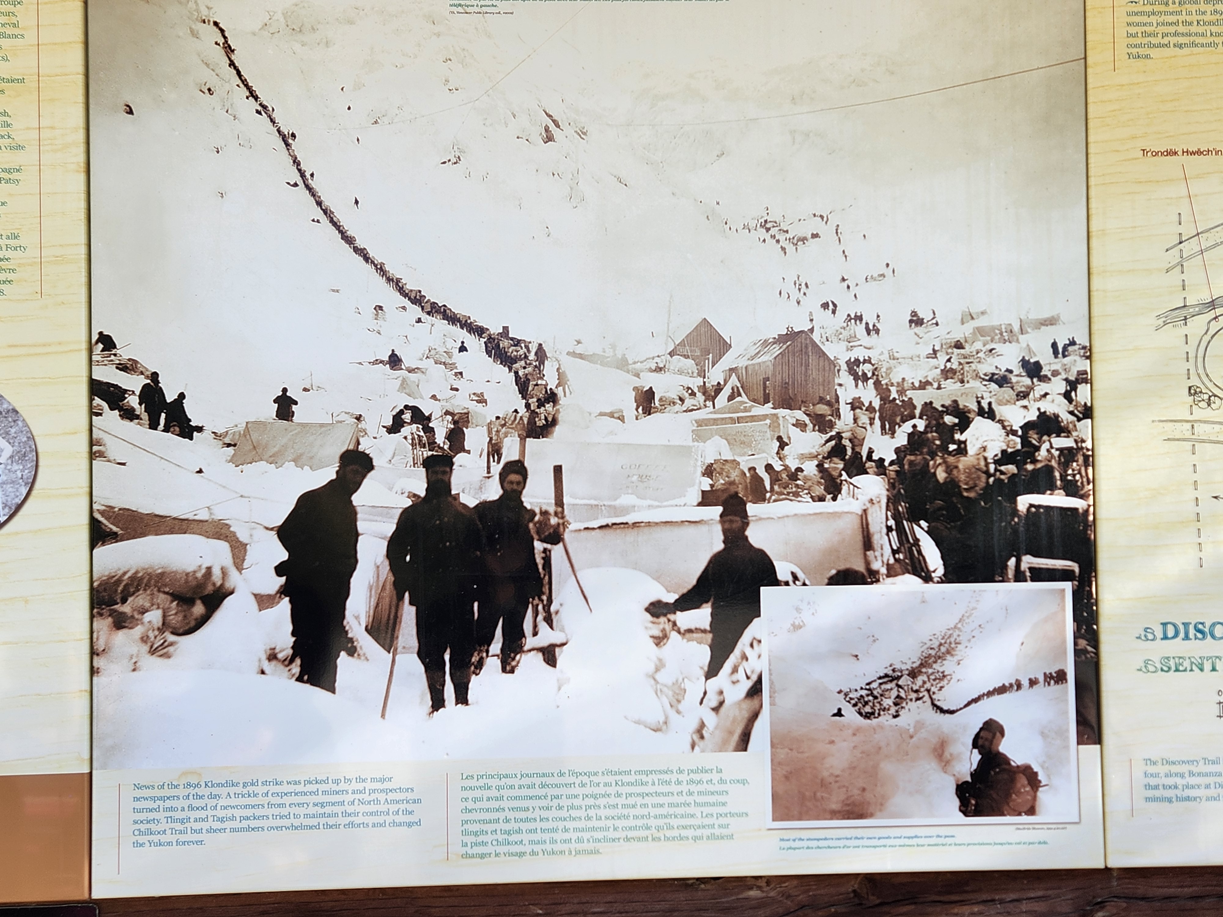 About 1.5 kilometres (0.93 mi) south of the dredge's current site, further into the Klondike Valley, is the Discovery Claim where gold was found in August 1896 by prospector George Carmack, his Tagish wife Kate, her brother Skookum Jim, and their nephew Dawson Charlie. This is considered the site where the Klondike Gold Rush began.
