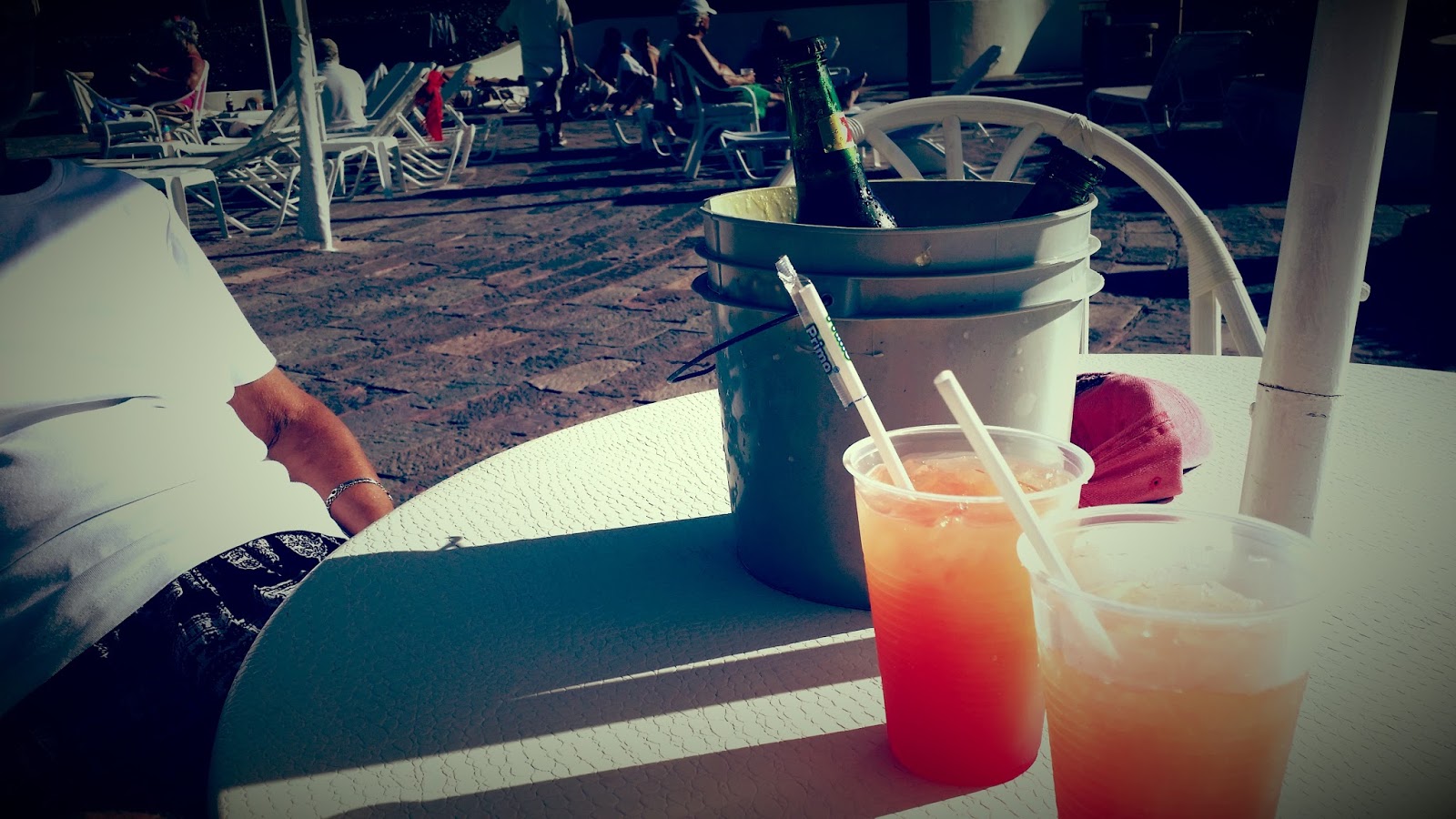 Afternoon walk on the beach and a Happy Hour by the pool. That yellow building almost in the middle is Royal Villas where we stayed the first two weeks here.