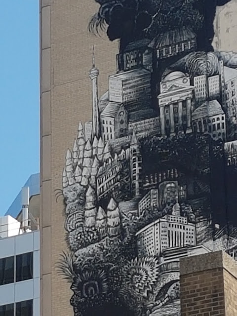 The image itself is Phlegm’s creation, but it wasn’t designed in isolation. He proposed the idea of creating a human body out of iconic Toronto landmarks—the CN Tower, old city hall, St. Lawrence Market, the ROM—to represent the city as a vibrant, living ecosystem. Then, after consultations with local residents, he also integrated their suggestions, such as ravines and certain buildings.