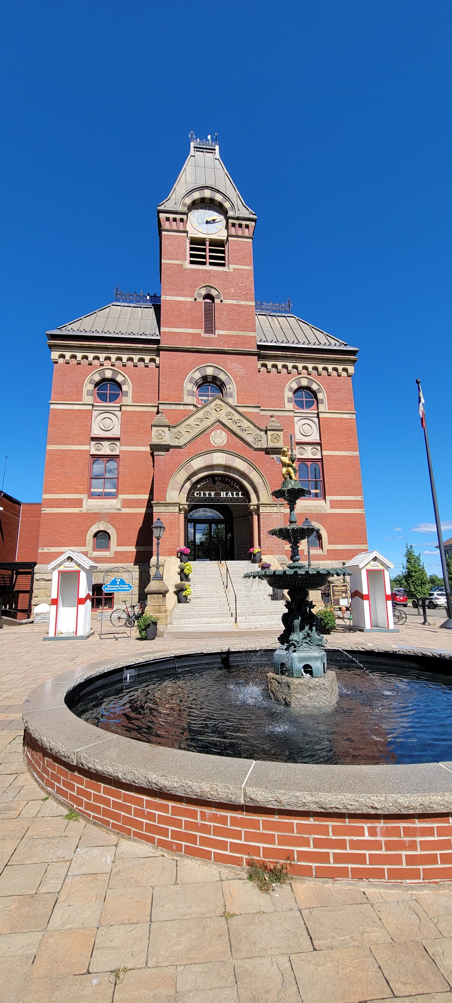 The Fredericton Lighthouse is a faux lighthouse on the bank of the St. John River in Fredericton, New Brunswick. It was constructed in 1989 and has never served as an official aid to navigation. It is near the historic Garrison District in downtown Fredericton. Originally privately built, it has been operated by the Fredericton Tourism Bureau since 2002.Fredericton's City Hall, built in 1876, is the oldest one still in use in the Maritimes. Visitors are welcomed to the City at the Visitor Information Centre located in the lobby, and can tour the Council Chamber, see the restored clockworks and a series of commemorative tapestries which are on permanent display. *Until 1952, the square in front of the building was used as a public farmers' market.